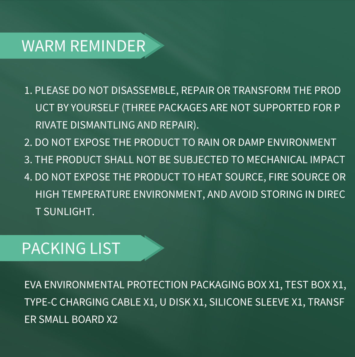 4. Do not expose this product to heat sources, fire sources or high temperature environments, and avoid storing in direct sunlight