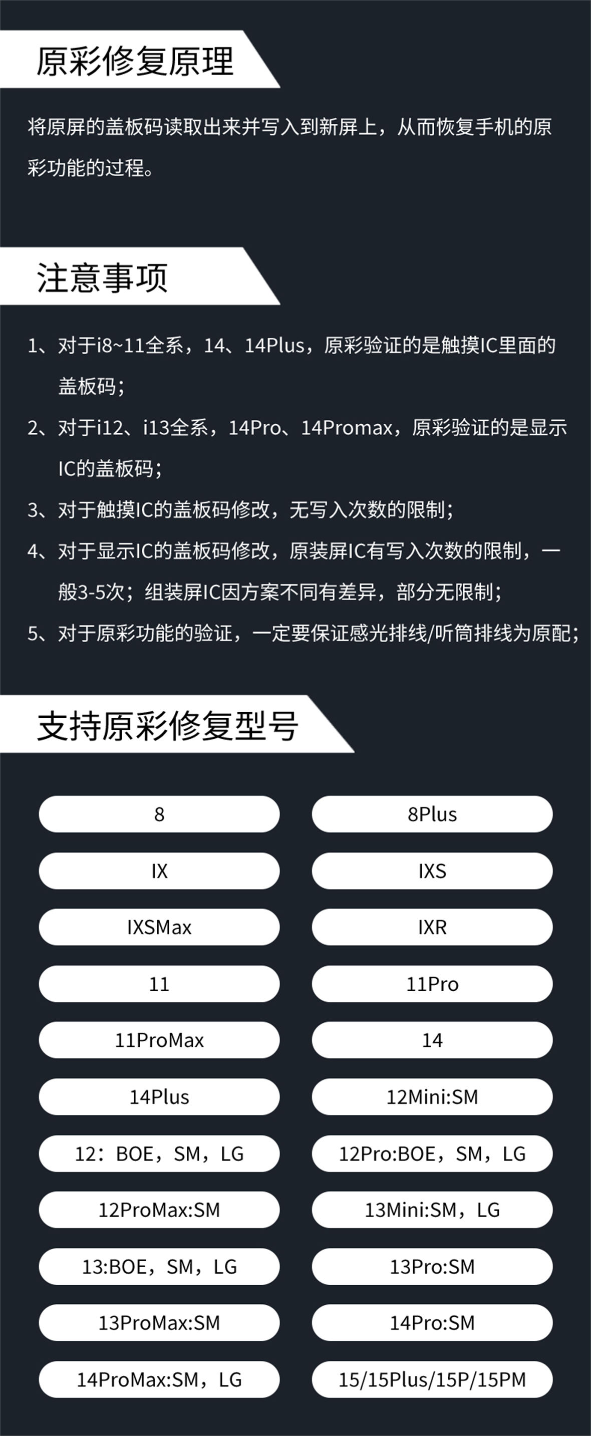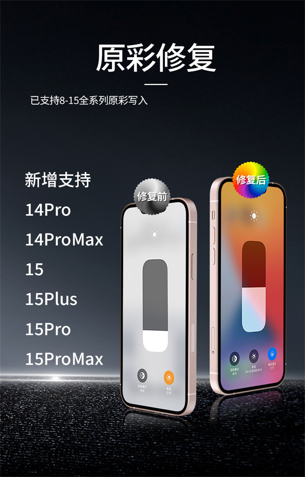 设备用途:用于手机屏幕原彩修复、电池健康度修复校准、原装方案无资料屏(OTP)