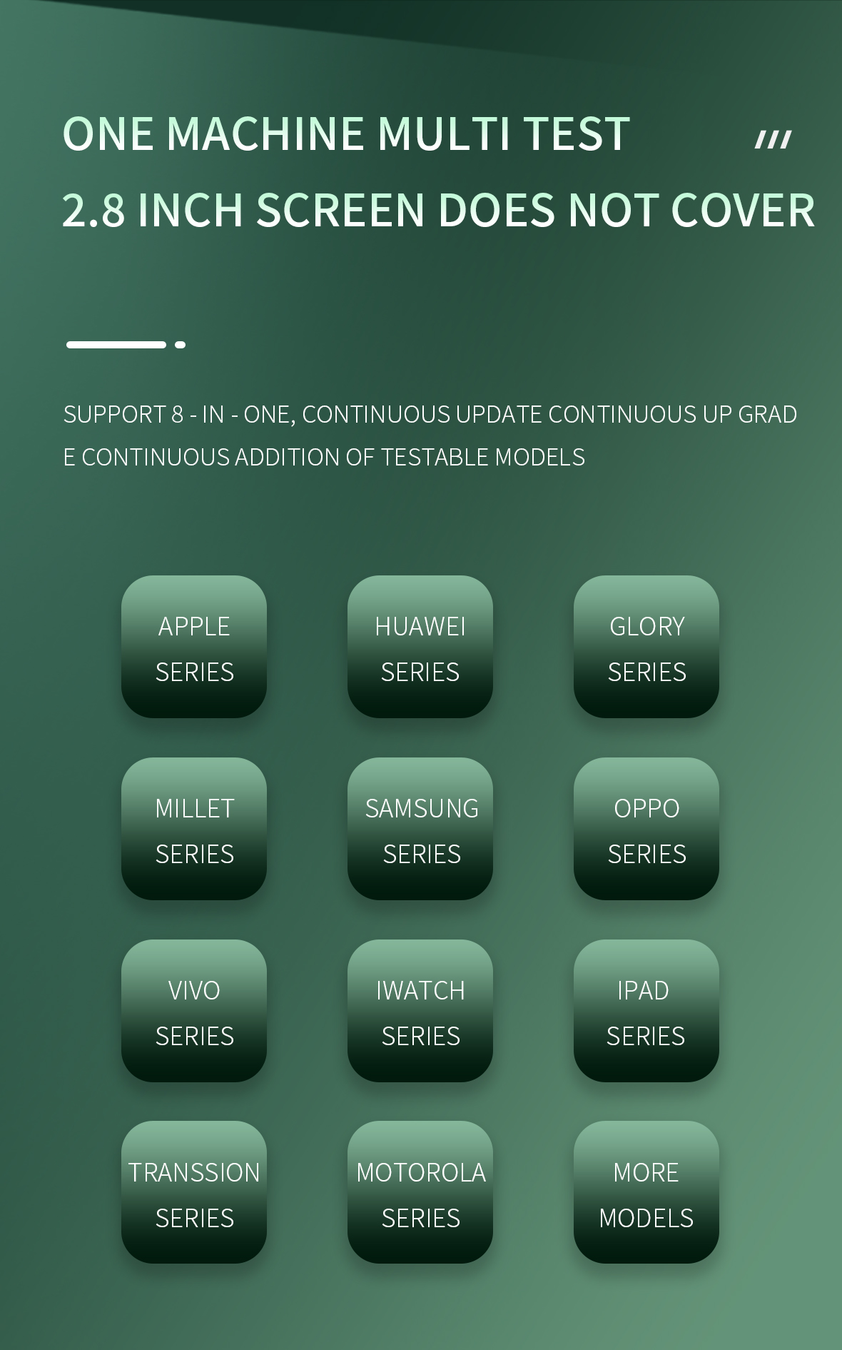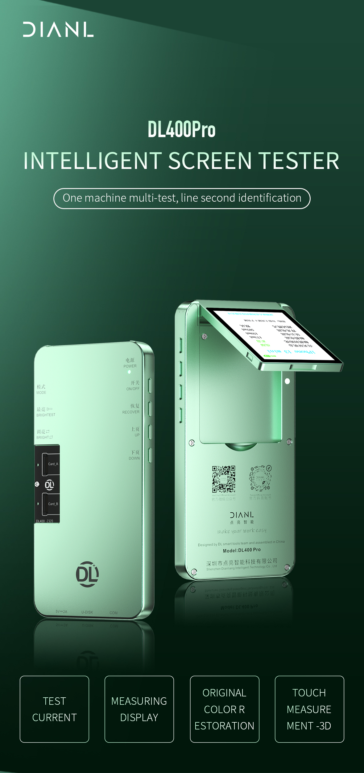 Applicable brands of DL400 Pro Smart Screen Tester: One machine with multiple tests supports 8 in one; 2.8-inch large screen in the same body is not covered; Apple series, Huawei series; Honor series, Xiaomi series; Samsung series, OPPO series.