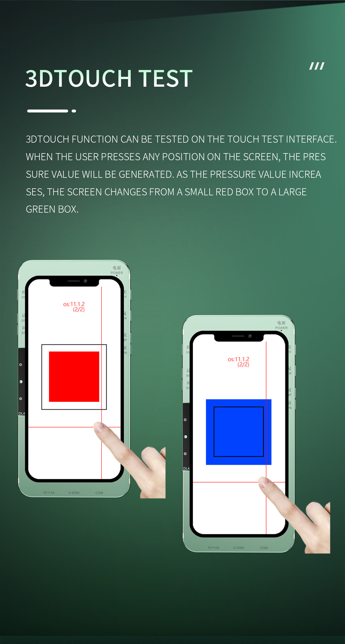 3DTouch test: The 3DTouch function can be tested on the touch test interface. The user presses anywhere on the screen to generate a pressure value. As the pressure value increases, the screen changes from a small red square to a large green square.