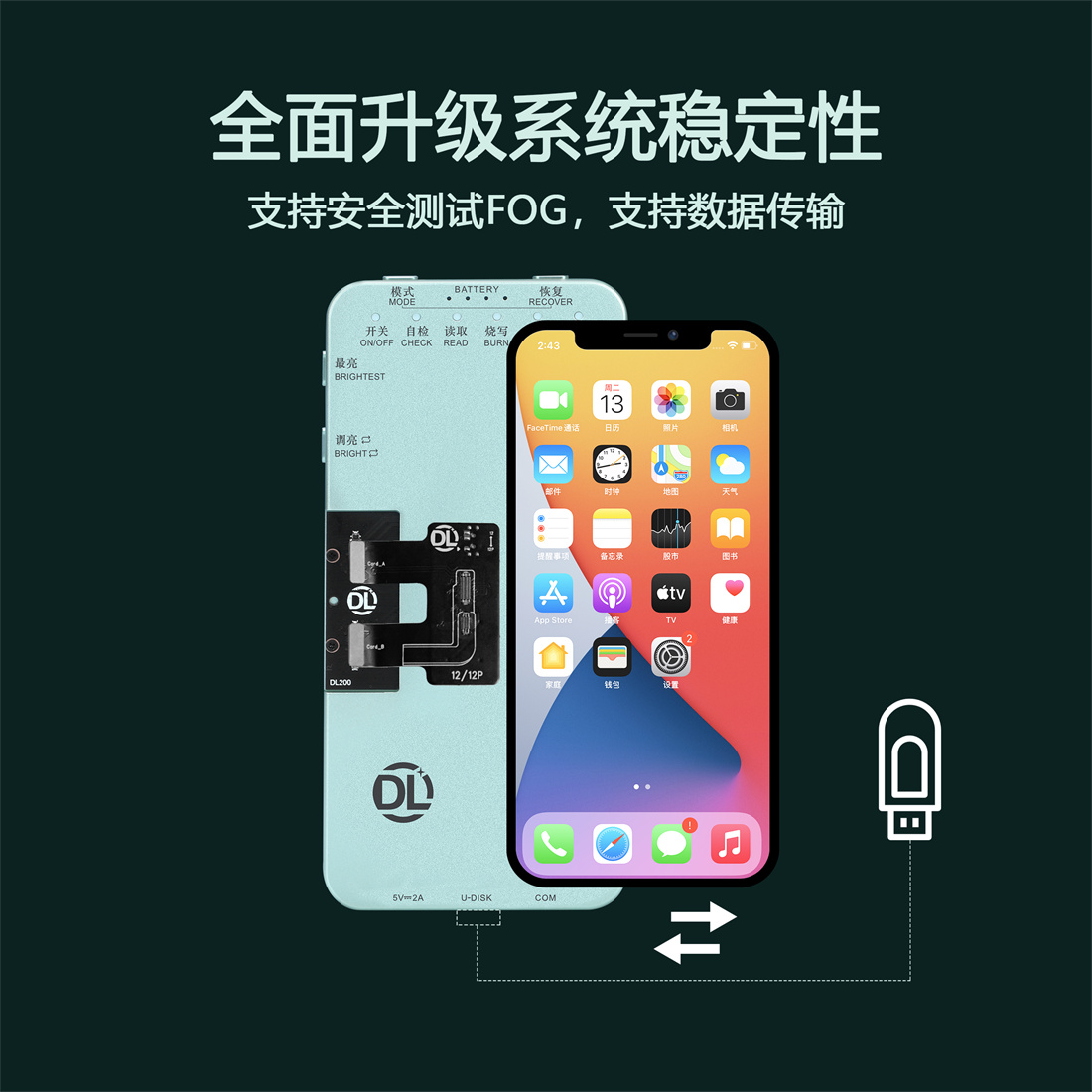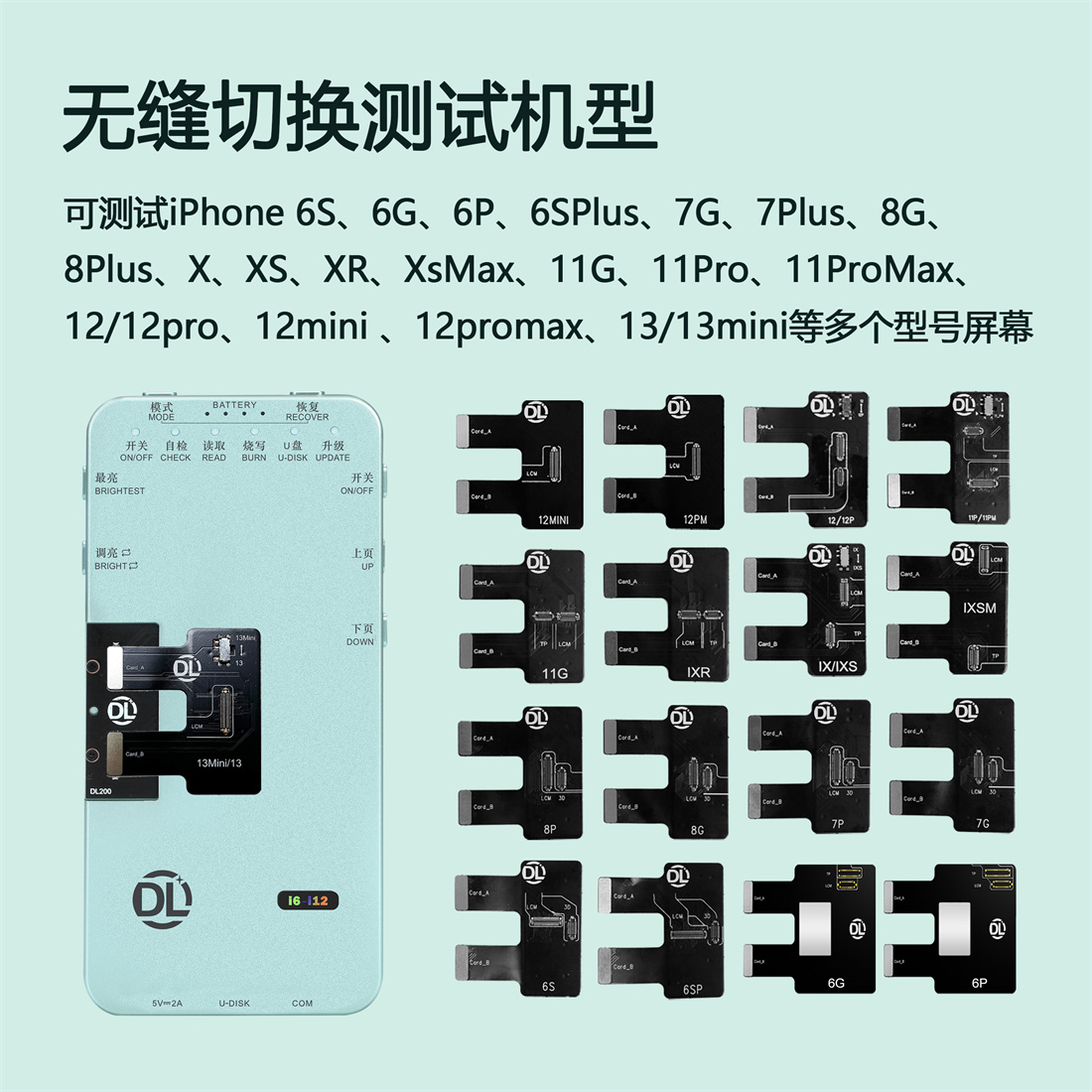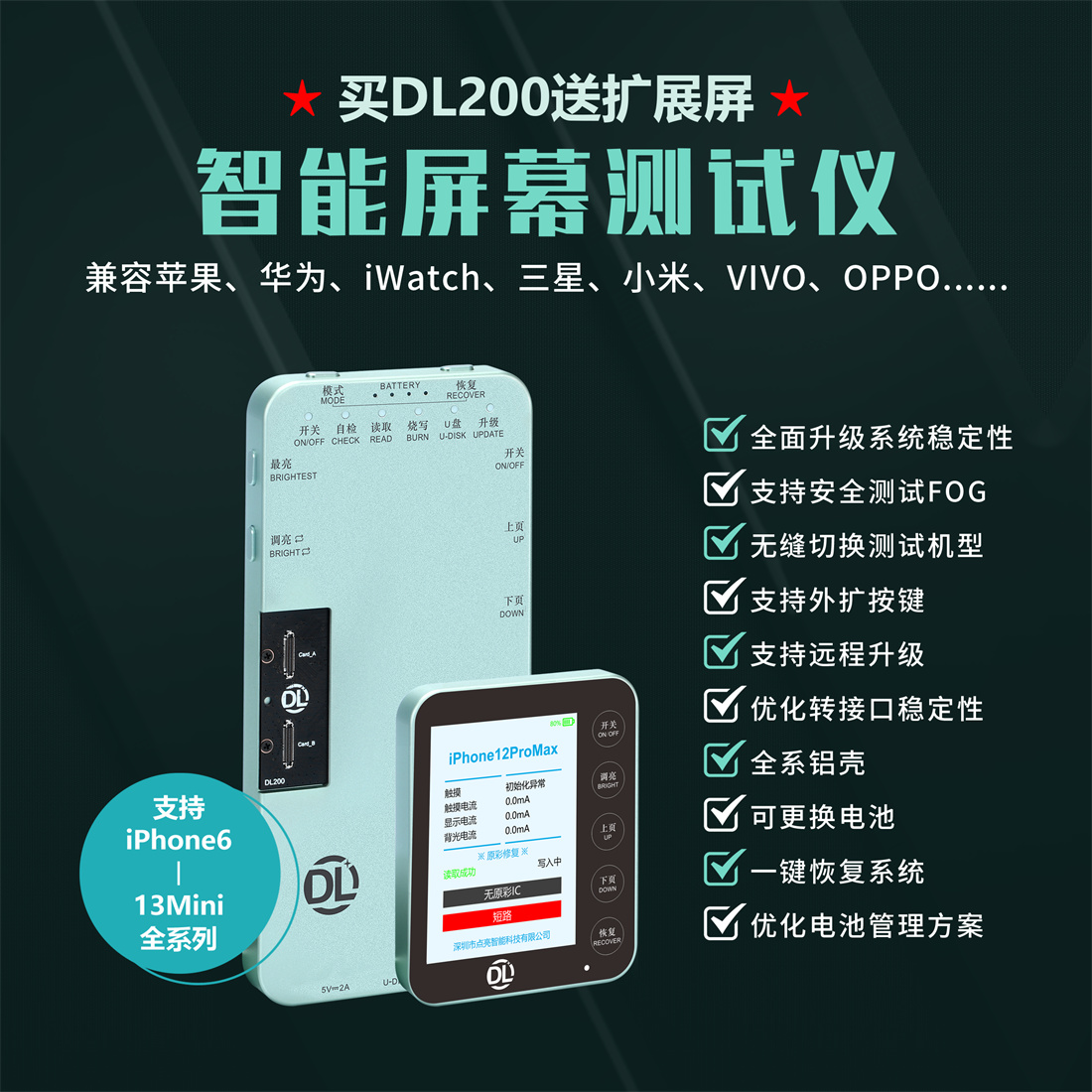 DL200是一款多功能的屏幕测试仪,支持苹果+华为+iWatch三合一,测屏准确全面,全面升级系统稳定性,支持FOG测试,